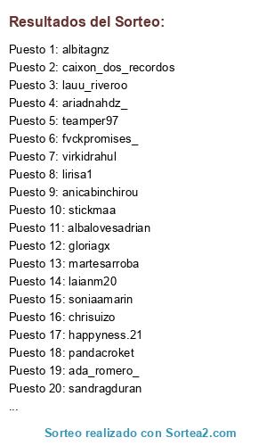 Lista de participantes: lirisa1(3 participaciones), cristigomez95, ursulfr, lauxoaninha, lucia_coutado(2 participaciones), nuriamandi, monroemm(2 participaciones), jesiiglesias(2 participaciones), andreacollazo5, martesarroba (3 participaciones), sarukavn(2 participaciones), amesias_ (3 participaciones), esther_gonzalez012, garcia_arca, eneangotx(2 participaciones), magoncar, ddomingoalicia(3 participaciones), ariadnahdz_(3 participaciones), nicolasalaja, marclesol, rocio.volluz, ntblz(3 participaciones), naknafetasanningen, silviadiz13, marinaruedaflores, adriana_r31(2 participaciones), aaroalago(5 participaciones), alba_freiria, estefaniape, antiamrtnz, albitagnz(14 participaciones), carolina_ap(4 participaciones), golden136, 8monicaknowles, lagolidia(5 participaciones), laritasosa, helda9(4 participaciones), nataliaap_, sandragduran, its_mimi96(3 participaciones), bkbeksbeca, irenerocco(2 participaciones), antiawolf, saracardenasr, aiitoryneerea, soniiamzz, liliiemm(4 participaciones), yaii_martinez267, mariviky96, 11neca, chrisuizo, noerodriguezbarreiro(4 participaciones), mariatrdz(3 participaciones), saraicperez, yaizaglezglez, olatzigerategi(3 participaciones), evaalvarez97(2 participaciones), veronicatl, esthhheroide(7 participaciones), teamper97(3 participaciones), lauriita_llm(3 participaciones), verogalleg8l, nuria_.27, xoanaroddriguez(2 participaciones), danielrodance, anabelenstyles, marinadoooor, zoelucia11(3 participaciones), impiula, barbara_lvt, laianm20, anicabinchirou(6 participaciones), zinteta, laura_gomariz, martajazzz(5 participaciones), efonsor, rosana_pm, marisool63, todasfeministas, happyness.21(5 participaciones), martaaliu97(4 participaciones), sylvia_ramos, sweetrainingrx(2 participaciones), nuuri_2001(3 participaciones), litlasskikr(3 participaciones), chrislm3, luciaamarin(2 participaciones), soniaamarin(6 participaciones), virkidrahul, albalovesadrian, gela_rincon, la_raya_(6 participaciones), paulaggarcia2000(4 participaciones), lauraagl2000, stickmaa(4 participaciones), caarmensalaas(2 participaciones), laurapepinera, alisrmos, solcinalli(2 participaciones), mariiaol(3 participaciones), ichi_10, paulacaballero99(2 participaciones), lujaninvernizzi(2 participaciones), choco_pandi(9 participaciones), key.kvrita(2 participaciones), emmittachan(5 participaciones), laura_salgo, taniavila_13, anamariagranadosruiz, almusil, caixon_dos_recordos, gloriagx(2 participaciones), anitaroto(2 participaciones), martavillalba_, anaquesadag, aridnahdz_(2 participaciones), mariajoselz12(3 participaciones), tamiisiete, ada_romero_(2 participaciones), pandacroket(2 participaciones), imanasri, veroji87, maiz.chel(3 participaciones), giselavalls, monikiwy, natalia._.mj, ambaaaaaaaaaaaar, fvckpromises_(3 participaciones), isaortize, ana_lloret(2 participaciones), lauu_riveroo(3 participaciones), ohallorankath3(3 participaciones), _srtta_h_19, carlotasieiro, bearuizgr3, maarta04.