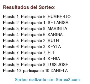 Lista de participantes: Participante 1: SET ABISAI , Participante 2: RUTH , Participante 3: KEYLA , Participante 4: KENIA , Participante 5: HUMBERTO , Participante 6: KARINA , Participante 7: ELI , Participante 8: LUIS JOSE , Participante 9: MARINTIA , participante 10 DANIELA.