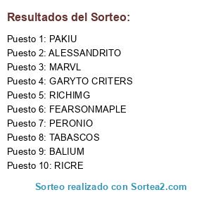 Lista de participantes: ALESSANDRITO, BALIUM, FEARSONMAPLE, GARYTO CRITERS, MARVL, PAKIU, PERONIO, RICHIMG, RICRE, TABASCOS.