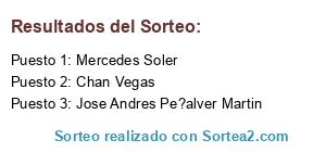 Lista de participantes: Adela Molina Rebollo(6 participaciones), Africa Martinez Martinez(-), Alberto Simón(7 participaciones), Alfonso Herrera(5 participaciones), Alfredo Peralta(6 participaciones), Alicia Carrero Marcos(6 participaciones), Almudena Gonzalez Mu?oz(6 participaciones), Ana Bronchal(-), Ana Maria Segovia Mate(-), Ana Teno Ferrera(-), Andrea Haro(-), Angela Carpente Garcia(2 participaciones), Angelines Fernandez(6 participaciones), Anna Balabanova(4 participaciones), Anna Gili Soldevila(-), Antonia Corbacho(10 participaciones), Antonio GN(6 participaciones), Aurora Carretero(-), Aurora Cf, Azu Cigales(6 participaciones), Beatriz Marcos(-), Bienve de la Rosa(8 participaciones), Buscador de Sorteos(-), Carmen Alvarez(-), Carmen Blanco F(10 participaciones), Carmen Ceballos(-), Carmen García Moreno(-), Carmen Rodriguez(6 participaciones), Carmen Vegas(2 participaciones), Carmen Zapico Zapico, Carol Viola(6 participaciones), Carolina Adan(6 participaciones), Carolina Mami Duna(5 participaciones), Cecilia Bellver Morell(2 participaciones), Chan Vegas(9 participaciones), Charo Gonzalez Galindo(-), Charo Romero Álvarez(2 participaciones), Chris Hana(-), Cindi Maria Onecha(2 participaciones), Cipriano Moreno Aparicio(10 participaciones), Concepción López DEL Castillo(-), Concepcion Matias Simarro(-), Conchi Blazquez(2 participaciones), Concursos Regalos(6 participaciones), Cristina González Bello(-), Cristina Jurado(4 participaciones), Cristina Soria Vilella(4 participaciones), David M. Martínez(15 participaciones), Domingo Carrique(12 participaciones), Eduardo Postigo(-), Elena Kalyakina(6 participaciones), Elena Knyazhechenko(12 participaciones), Encarni Estévez(-), Encarni F. Estevez(-), Ester Fernandez Muro(-), Ester La Fera(6 participaciones), Esther Lopez Flix(-), Esther Mu?oz Martín(6 participaciones), Estrella Sierra(6 participaciones), Eva Fortu?o(-), Eva Mari?o Sánchez(-), Fani Lopez(2 participaciones), Fidel Rivera Sanchez(-), Fina Benavides(3 participaciones), Flor BG(5 participaciones), Florin Ilie(-), Francisco González(2 participaciones), Gema Garate Embid(-), Gloria Urquidi(5 participaciones), Gregorio Maté Calvo(-), Imma Le(5 participaciones), Inma Cervera(-), Inma Vere(5 participaciones), Irene Masip Morte, Isabel Teis Tarinas(6 participaciones), Isadora Mayandia(-), Ivan Monzon Garces(-), Ivan Repullo del Rio(-), J Maria Rico Gardu?o(7 participaciones), Javi Salinas(6 participaciones), Javi Salinasa(3 participaciones), Javier Torres Lozano(6 participaciones), Jennifer Bonilla Pizarro(-), Jennifer Romero(-), Jenny Perez Diaz(3 participaciones), Jesus Fernandez Romero(11 participaciones), Jose A. Bayon(10 participaciones), José Alberto Pérez(-), Jose Andres Pe?alver Martin(5 participaciones), Jose Antonio UH(2 participaciones), Jose Ignacio Martinez Gonzalez(-), Jose Martinez Gonzalez(7 participaciones), Juan Alberto Gutiérrez Díaz(8 participaciones), Juan Carballal(6 participaciones), Juan Espinosa(-), Juan Guillen(6 participaciones), Juani Gonzalez Bachiller(2 participaciones), Judith Pérez(5 participaciones), Juli Osado(-), Julia López López(4 participaciones), Juls Galan(-), Kapitana Corsaria Pirates(11 participaciones), Katerina Knyazhechenko(11 participaciones), Lali Pujala(-), Loli Gonzalez Bejar(7 participaciones), Loli Moreno Izquierdo(-), Lucia Xaica(-), Luis Manuel Rubio Alvarez(9 participaciones), Luisa Maria Garcia Repiso(-), Luisa Menargues(6 participaciones), Lydia Lopez Millan(5 participaciones), Mai Tesoro(-), Maite Sotos Bataller(2 participaciones), Mamen Diaz Pontes(2 participaciones), Mamenjoaquin Payan Morales(2 participaciones), Manoli Valdes, Manuel Torres, Mara Make Up(4 participaciones), Mari Gutierrez Cordero(-), Maria Colomo Diaz(17 participaciones), Maria Jesus Alvarez Lopez(10 participaciones), Maria Jose Lopez Velasco(-), Maria Jose Martinez Gonzalez(23 participaciones), Maria Kostova(-), María López Iglesias(7 participaciones), Maria Martin Valencia(-), Maria Megias Nu?ez(-), Maria Monica Barcia Lago(-), María Otero Doural(-), Maria Pilar Ortiz(0), Maria R Simon(-), Maria Victoria Martos Sanchez(14 participaciones), Maria Wasmer Romero(6 participaciones), Mariangeles Sales Perales(-), Maribeco Cp(12 participaciones), Marius Emanuel Cazan(-), Marta Diaz Alvarez(4 participaciones), Marta Morales López(-), Marta Rivas, Megan VialMasters(-), Mercedes Soler(7 participaciones), Meritxell Rosique Reixach(-), Merxe Tomas(-), Michaela Weissova(11 participaciones), Miren K Hernandez(11 participaciones), Monica Gonzalez(-), Mónica Prieto García(5 participaciones), Monica Sanchez(-), Montse Fernandez Martin(-), Nagore Arostegui Rojo(6 participaciones), Natalia Prieto Garcia(2 participaciones), Nena Oliveira(-), Noelia Rodriguez Olivares(-), Nuria Bueno(-), Núria Garcia(6 participaciones), Nuria Macías G(2 participaciones), Nuria Perez Ortega(2 participaciones), Nuria Tressols Piquer, Pablo Rubio Prestel(6 participaciones), Pantus Bodas(-), Patricia Garcia(-), Patricia Sola(6 participaciones), Patricia Villaca?as(-), Perlica Cosmetiques(-), Pilar Castillo Porras(-), Pilar Gil Costa(6 participaciones), Pilar Perez(-), Pilar Vidal Guijarro, Pilari Pilar Lo(-), Rmaria Camacho(2 participaciones), Rocio Arrás(-), Rosa Rodriguez Ortiz(6 participaciones), Rosana Pulido Perez(5 participaciones), Rosi Jabalera(12 participaciones), Rosi Pizarro(-), Ruth Sanjuan(2 participaciones), Sarina Alvarez(4 participaciones), Sergio Arnaiz Delgado(-), Silvia Blazquez Ortega, Silvia Odener(-), Sky Render(7 participaciones), Sole GP(6 participaciones), Sonia Garate Embid(6 participaciones), Sonia Martin Gonzalez(6 participaciones), Susana Martinez Gomez(5 participaciones), Susana Palacios(2 participaciones), Tere Vegas(0), Titi Bruja(0), To?y Torres, Vanesa Garcia Valera(5 participaciones), Vanessa Fernandez(7 participaciones), Vanessa Mu?iz Alvarez(4 participaciones), Veronica Gomez(5 participaciones), Xandratelier Shop On Line(5 participaci