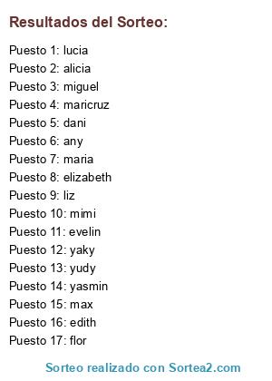 Lista de participantes: miguel, max, maria, yudi, flor, anny, miriam, edith, lucia, yazmin, liz, yaki, evelyn, alicia, dany, ely, maricruz.