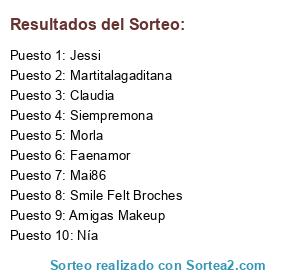 Lista de participantes: Araeeli, Noah, Belen, Victoria1, Ana Belen, Irene, Olgaz, Siempremona, Nosotras (Olgamcarmona), Morgan, Hrista, Miss Potingues, No sin my make up, Muyuyu, Esther1, Gadirroja, Luz, Silvia, Andrea Cuesta, Ana Make Up, Melatche, Betsabé, N. Poe, La Niña Mariposa, Miss T., Happy Eyes, Flordtarong, Miriam, Rosspike, *Paty”, Valeria, OlgaS, Emma, Asun M, Rachel, Bettie, Lary, Ketxia, María Riccia, Bellleza2, Joana, Varitatul, Satelitas, Elsolque más enfria, Paxindia, Melomana, Izas, Laky, Claudia, Doctora fan, Branca de Neve, Ana, Luna Encaprichada, Bimbaya, paracaison, May V, Marisa, Odaklesam, Carol, Inma, Aidabenaiges, Lali, Caniopea, Athinna, Silfanocturna, marina, Sonia Herrero, G.Brocante, Svarada, Gangial, Patry, Paz, moli, Make Up Nyna, Kyllie, Montse, Brisamalva, Samantha, Pitussia, Lola.mine, Dry martini, Ninfita28, Missan, Diana Giunta, Beatriz, Almanzor, Tarta6, Jessi, Lunae, Yurena, Rosa1, Texenery, Mayte R.M., Marylandspain, Maialen, Cerezas de Tul, *May*, María Glez, Laura1, Mery2, Fisiwoman, Lourdes, Atlanterra, Karmami, Chelo, Alicia Guerrero, Marisal, Veronica 1, Marc, Ivich-activa, JoseJomez, Juani, Maruji2010, Paco-espa, Salvadoraaa, Victoria2, Isabel, Clarasori, Rosa Marin, Nekane06, Flamenquita3210, Meri, Sorayair, ROSA2, Marilo, Kinder (Carenas2009), Vero77, Rufis21, Estelbalu, Nemo, Kumiko, Meredith, Miss Soler, AdAm, Isa1, Coque-ta, Bosquinas, Mayoret4, Esfingesa, Pao-0811, Sandra, Mariant, Lorena1, Ziloilt, Missdara(mtbg76), Palu, Sirocox, Marina, Marian1, Maria(tansolopoemas), So Chic, My Pink Bubble, Amigas Makeup, Luna, Silfahada, Cocude, Amore, Theradiostar, Faenamor, Sisiemp, Destello, Volcama, Katya Noia, Duna, Lau2489, Lourdes Arellano, Rosita1, Malval56, Urraca, Gabu, Hada, Granjablogperros (Cliapego), Welzen, Pensee, Sora María aguyé, Perlica84, MDA, Mai86, Buxa9, Mar, Aridaza, Morla, Pincelata, Lulunoa, Nayru, Pedroalmela, Caballitta, Laura2, Smile Felt Broches, Isisabel, Maria Jesus1, Rosa3, Choc o-chic, Danui, Sinsolmar, Maria Bueno Bouza, Arca27, Orbitania, ArVel, Hechizzera, Bellidoni, María Rosa, Lucía, Clasica, Mi Zona Zero, Lpm660, Mª Cristina, Enma, Osura55, Gurru, Virginia (Virgi-rojo), Celia, Ani, La reina cotilla, Lorena2, Katerina, Montanoa, Corasson, Bloody Roose, Aire, In my Closet, María Angelica, Nur, Malebaja, Sara(Sara-up), Tardesa, Laura3, Montsearias, Animoerotico, Manuela, Nía, Silvia perez, Mary Carmen, Tatiana Alexia, 3ly, Rali31, Sonia, Factoria de Colores, Veronica2, Jewel Style, Francisco, Cristina Castellon, Cristina madridbeauty, Teté Valero, Isa2, Nanyky, Lebasi, Carmen, Elena1, Isa3, Belisa, Sara Gonzalez, Neus, Sara Cancio, Marta, Maria a diez, Ventolinos, Kalambaca, Los colores de Amy, By Now, Miss Celofán, María Jesus2, Andrea1, Marguar, Ro., Lucyboop, Alba (tochic..), Gemma, Melywonderfull, StrangeQuark, Martitalagaditana, GMR, Dafneluna, Cecilia, Kasumi, Amanda, Cris sevilla, Mariafranes, Elena2, Lolailobroches, Son, Pink Rose, Marian2, Crisbath, Tifonamar, Dulce, Natusios, Yedrasol, NonaMakeUp, Alfeizar, Anita, Mireille S, Ana Ferreira, Lore, Esther2, Andrea2, Nuria, Soniuku, Cristina, Mapachito, Josefa, Belinda, Auro11, Meryy, Escribata, Noemi, The Allure House, Silverstargirl, Is, Maria, Miss Thirty, Patricia, Sadi, Gabriela, MLDLR, Lydia, Pilar, Maca Sastre, Sarah Hussain (Innocent122), Sus, Lunadeurano, Piruja, Dori, Angela82, Nicamum, Thifa, Dear Diary, Marietax, Blanquita747.