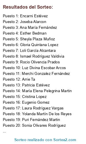 Lista de participantes: Vero Domingo Herrera(3), Germán Fernández Aljarilla(3), Laura RodrÃguez Vargas(3), Mari Maldonado Mar De Estilos(3), MarÃa Elena Pelegrina Martin(3), Loli Olivencia Prados(3), Paqui Quintana(2), Julissa Germosen(2), Rafa Tamara Lopez Gómez(2), Joseba Alarcon(2), Carmen RF(2), Loli GarcÃa Alcantara(2), Desiree Vazquez Correa(3), Yolanda MartÃn De los Reyes(2), Arrie Ta(2), Eugenio Gomez(2), Encarna Salvador Hernandez(2), Montse Urrutia(2), Lola Vergara(2), Tatiana Egorova(2), Mari Maldonado López(2), MarÃa Dolores Trujillo Vargas(2), Marta Céspedes Sedano(2), Mari Pérez(2), Puri Fernández Martin(2), Toñi Villegas Godoy(2), Maria Trinidad Sánchez RodrÃguez(3), Esther Bedman(2), Loli Molinero(3), Antonia Guisado, Ana Manzano Verdejo, Carmen Galdeano(2), Mari Carmen López(2), Mary Ruiz, Patricia Cervera Hontanilla (3), Isabel Pérez Galvez(3), Francisco Javier Baron(2), Ana MarÃa Fernández, Merchi Gonzalez Fernández(2), Gloria Quintana Lopez, Javier Reyes Martinez, Carmen Navarro del Rio(2), Jose Esteban Pérez Pérez(3), Maria Del Mar Exposito Alias, Paqui Lucas GarcÃa, Patricia Estévez(2), MarÃa Jesús Mata Carretero, Mari MartÃn Reyes(2), Rocio Manzano Lopez(2), Pablo Pablood Anco, José Antonio Barrera EspÃn(2), Maria Flores Antequera(2), Mariola Lozano Laó(2), Antonio Jose Amat Lopez, CarmenMari Bogas Lorenzo, Luz Divina Escobar Arcos(2), Rocio Gutierrez Jimenez(3), Sergio Bosquet Utrilla(3), MarÃa Pérez Crespo(2), Isa Prados(2), Maricarmen Jodar Valero, Sheyla Plaza Muñoz(2), Florenta Stancu(2), MarÃa José Pérez Gálvez(3), Sylvia Yolanda Luque Vargas(2), Mara Navarro enciso(3), Pedro Luque Torres, Maria Del Mar Domingo Herrera(3), Babette NaPle(2), Rosario Maldonado(2), Carlos Antequera Luque(2), Montse Fernández(2), Noelia MartÃn Peña, Ismael RodrÃguez Valdivia(2), Rocio Olivencia Prados(3), Alba Isabel Peña Uclés(2), Maria Soler Alvarez(3), Primitivo Francisco Estévez Martos, Melisa Volckaert Gualda(3), Susana Arenas(2), Cristina Lopez(2), Paqui RodrÃguez Sierra(3), Paqui Campos Sánchez(2), Jessica RodrÃguez Sierra(3), Sonia Olivares RodrÃguez(2), Aida Sánchez(2), Leo Cervantes(3), Mari Carmen Linares Soler(2), Encarni Estévez(3), Sara Ayesh(3).