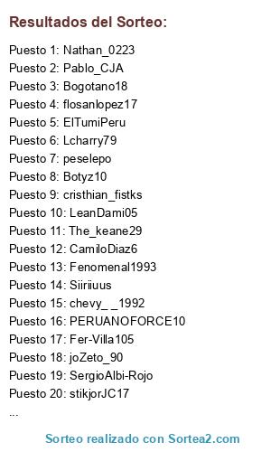Lista de participantes: chevy_ _1992, Mariosofrv, fricknopa_fcc, camilo0512, Nacional110, X_Juankmfc_X, laujan1218, Garysnakeye, Bogotano18, DavidGutierrez2, Tinchomul, Lgrand10s, Carpal305, nelsinho23, maxxi_27, Juanse_aoki, Pepeasesino1, ElTumiPeru, stikjorJC17, Valcrist, PERUANOFORCE10, davidal1014, Botyz10, Fenomenal1993, onlysantew, Colombiannicko, Mateo_CFI, melendez_marco, Ricawoody14, FF-GERMAN, Jovanny1981, snake-075, snake-0751, Nathan_0223, peselepo, Hetchiring, DECANO_TORRES, Tu-muert3, jotalnator, Cfc_Zlatan, SergioAlbi-Rojo, matiasmarin2014, LM_Mafla_I9I, ironmaneslaond, cristhian_fistks, JAZON10FCB, Leodiaz_27, Axuby, Torettao-CFI, HND _ - Marcos - _ HND, o11ceCaldas, Lcharry79, LeanDami05, The_keane29, Ramagol5, torettoidag, XxfAlcoxX_, JavierOp915, flosanlopez17, adonko, Juanksh1133, Siiriiuus, joZeto_90, Cajf, JulianMB1986, Polaniar, CamiloDiaz6, YSIKSTBN24, JMpIx, Naluffy-D, JR-Palazzo, WillMolinag, Lokombia_27, diegoalvarez12, Andresmesa11, Unseaminghawk, Pablo_CJA, Yalexito7, Fer-Villa105, porritas.