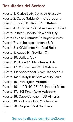 Lista de participantes: l10l Tony: Rayo Vallecano, Panterjack: Villareal, il javi 17: Manchester City, Adrilozano: Atlas de mexico, Mr Juanitus RCD Mallorca, Jorchebopa: Levante UD, Sr Pistolas 86: Juventus, xXxValientexXx: Real Betis, Aguuu l7l: Sevilla FC, BaIIes: Ajax, l Mas7eeRz l : Galatasaray, CarlosBD9: Celtic de Glasgow, eSencial alpiNo : AS Roma, Xx eL SaMu xX: FC Barcelona, Jimmy Baek: Borussia Dortmund, Juanfran333: Malaga CF, IL PRINCIPE I22: Inter de Milan, zZzZ JONA zZzZ: Totteham, Ivan l 96 lx: Atlético de Madrid, AbeeceedariO v2: Hannover 96, x el pardela x: CD Tenerife, Jose Granada97: Bayer Munich, PuTTO ViiLa I: UD Las Palmas, Kuality100: Shrewsbury Town, Xx JoSe 7 xX: Manchester United, Xx KeNstaLL xX: Celta de Vigo, Andrew Torre: Real Sociedad, El Renegado95: Hamburgo, Carpier: Real Salt Lake, BUTR4666: Real Oviedo, Capo Canoneri: UD Almería, BestElTopillo: New York City.