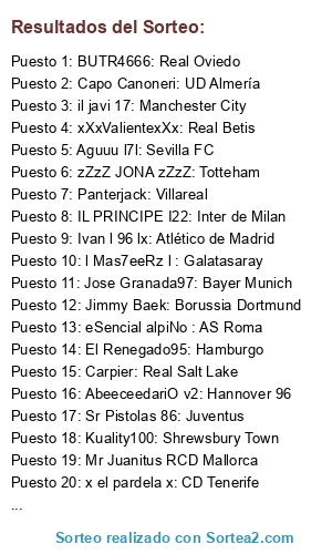 Lista de participantes: l10l Tony: Rayo Vallecano, Panterjack: Villareal, il javi 17: Manchester City, Adrilozano: Atlas de mexico, Mr Juanitus RCD Mallorca, Jorchebopa: Levante UD, Sr Pistolas 86: Juventus, xXxValientexXx: Real Betis, Aguuu l7l: Sevilla FC, BaIIes: Ajax, l Mas7eeRz l : Galatasaray, CarlosBD9: Celtic de Glasgow, eSencial alpiNo : AS Roma, Xx eL SaMu xX: FC Barcelona, Jimmy Baek: Borussia Dortmund, Juanfran333: Malaga CF, IL PRINCIPE I22: Inter de Milan, zZzZ JONA zZzZ: Totteham, Ivan l 96 lx: Atlético de Madrid, AbeeceedariO v2: Hannover 96, x el pardela x: CD Tenerife, Jose Granada97: Bayer Munich, PuTTO ViiLa I: UD Las Palmas, Kuality100: Shrewsbury Town, Xx JoSe 7 xX: Manchester United, Xx KeNstaLL xX: Celta de Vigo, Andrew Torre: Real Sociedad, El Renegado95: Hamburgo, Carpier: Real Salt Lake, BUTR4666: Real Oviedo, Capo Canoneri: UD Almería, BestElTopillo: New York City.