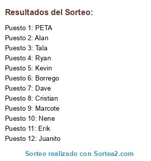 Lista de participantes: Dave, PETA, Borrego, Kevin, Erik, Juanito, Tala, Alan, Marcote, Nene, Ryan, Cristian.