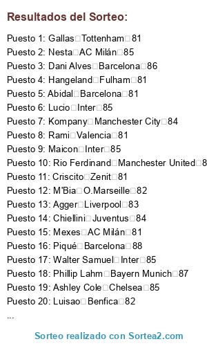 Lista de participantes: Vidic Manchester United 89, Thiago Silva AC Milán 87, Phillip Lahm Bayern Munich 87, Rio Ferdinand Manchester United 87, John Terry Chelsea 86, Nesta AC Milán 85, Evra Manchester United 85, Maicon Inter 85, Walter Samuel Inter 85, Lucio Inter 85, Ashley Cole Chelsea 85, Sergio Ramos Real Madrid 85, Pepe Real Madrid 85, Kompany Manchester City 84, Chiellini Juventus 84, Carvalho Real Madrid 84, Kolo Toure Manchester City 83, Ivanovic Chelsea 83, Vermaelen Arsenal 83, Sagna Arsenal 83, Alex Chelsea 83, Agger Liverpool 83, M'Bia O.Marseille 82, Luisao Benfica 82, Marcelo Real Madrid 82, Coentrao Real Madrid 82, Albiol Real Madrid 82, Mertesacker Arsenal 82, David Luiz Chelsea 82, Piqué Barcelona 88, Puyol Barcelona 86, Dani Alves Barcelona 86, Rami Valencia 81, Sakho PSG 81, Mexes AC Milán 81, Gallas Tottenham 81, Criscito Zenit 81, Bruno Alves Zenit 81, Hangeland Fulham 81, Abidal Barcelona 81.