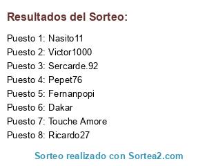 Lista de participantes: Victor1000, Pepet76, Touche Amore, Ricardo27, Dakar, Fernanpopi, Sercarde.92, Nasito11.