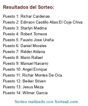Lista de participantes: Fausto Jose Ureña, Robert Torneos, Jesus Meza, Daniel Morales, Starlyn Medina, Mario Rafael, Manuel Navarro, Richar Cardenas , Beiker Stiven, Angel Enrique, Richar Montes De Oca, Wilmer Garcia , Ridder Aldana, Edinson Castillo Alias Michellin, .