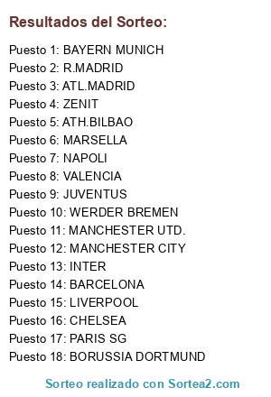 Lista de participantes: NAPOLI, R.MADRID, CHELSEA, BAYERN MUNICH, INTER, VALENCIA, LIVERPOOL, BORUSSIA DORTMUND, MANCHESTER UTD., ATH.BILBAO, PARIS SG, MARSELLA, BARCELONA, ATL.MADRID, MANCHESTER CITY, JUVENTUS, WERDER BREMEN, ZENIT.
