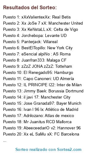 Lista de participantes: l10l Tony: Rayo Vallecano, Panterjack: Villareal, il javi 17: Manchester City, Adrilozano: Atlas de mexico, Mr Juanitus RCD Mallorca, Jorchebopa: Levante UD, Sr Pistolas 86: Juventus, xXxValientexXx: Real Betis, Aguuu l7l: Sevilla FC, BaIIes: Ajax, l Mas7eeRz l : Galatasaray, CarlosBD9: Celtic de Glasgow, eSencial alpiNo : AS Roma, Xx eL SaMu xX: FC Barcelona, Jimmy Baek: Borussia Dortmund, Juanfran333: Malaga CF, IL PRINCIPE I22: Inter de Milan, zZzZ JONA zZzZ: Totteham, Ivan l 96 lx: Atlético de Madrid, AbeeceedariO v2: Hannover 96, x el pardela x: CD Tenerife, Jose Granada97: Bayer Munich, PuTTO ViiLa I: UD Las Palmas, Kuality100: Shrewsbury Town, Xx JoSe 7 xX: Manchester United, Xx KeNstaLL xX: Celta de Vigo, Andrew Torre: Real Sociedad, El Renegado95: Hamburgo, Carpier: Real Salt Lake, BUTR4666: Real Oviedo, Capo Canoneri: UD Almería, BestElTopillo: New York City.