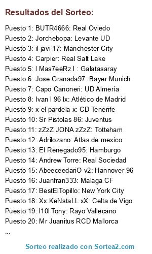 Lista de participantes: l10l Tony: Rayo Vallecano, Panterjack: Villareal, il javi 17: Manchester City, Adrilozano: Atlas de mexico, Mr Juanitus RCD Mallorca, Jorchebopa: Levante UD, Sr Pistolas 86: Juventus, xXxValientexXx: Real Betis, Aguuu l7l: Sevilla FC, BaIIes: Ajax, l Mas7eeRz l : Galatasaray, CarlosBD9: Celtic de Glasgow, eSencial alpiNo : AS Roma, Xx eL SaMu xX: FC Barcelona, Jimmy Baek: Borussia Dortmund, Juanfran333: Malaga CF, IL PRINCIPE I22: Inter de Milan, zZzZ JONA zZzZ: Totteham, Ivan l 96 lx: Atlético de Madrid, AbeeceedariO v2: Hannover 96, x el pardela x: CD Tenerife, Jose Granada97: Bayer Munich, PuTTO ViiLa I: UD Las Palmas, Kuality100: Shrewsbury Town, Xx JoSe 7 xX: Manchester United, Xx KeNstaLL xX: Celta de Vigo, Andrew Torre: Real Sociedad, El Renegado95: Hamburgo, Carpier: Real Salt Lake, BUTR4666: Real Oviedo, Capo Canoneri: UD Almería, BestElTopillo: New York City.