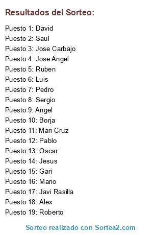Lista de participantes: Mari Cruz, Oscar, Jose Carbajo, Angel, Pablo, Javi Rasilla, Sergio, David, Roberto, Borja, Luis, Ruben, Pedro, Mario, Saul, Gari, Jesus, Alex, Jose Angel.