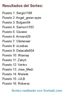 Lista de participantes: Delacalle954, Sergio1188, Oilsteneer, Roberss, Angel_green-eyes, Armand29, JJLB, Bulgaro04, Wasnay, Vertov, Zekyh, Giuwee, Jose_Medi, Saimon1393, Mariete, xLsebas.