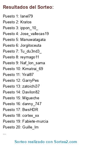 Lista de participantes: Ianel79, Kratos, Jose_vallecas19, Yiral87, Jorgitoceuta, Guille_lm, Lexusxxv, Kimatrai_69, Manuwatagata, cortex_xx, Bubo_79, BwsHDR, Tu_du3nd3_, danny_747, Fabiete-murcia, GarryPes, Losadita7, Naf_lon_sama, zatoichi37, Davilon82, Migueche, reymago11, ippon_10_.