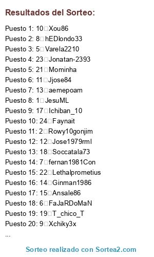 Lista de participantes: 1 JesuML, 2 Rowy10gonjim, 3 Halop123, 4 Eboy20, 5 Varela2210, 6 FaJaRDoMaN, 7 fernan1981Con, 8 hEDlondo33, 9 Xchiky3x, 10 Xou86, 11 Jjose84, 12 Jose1979rml, 13 aemepoam, 14 Ginman1986, 15 Ansale86, 16 Anyelote1985-, 17 Ichiban_10, 18 Soccatala73, 19 T_chico_T, 20 Nister_69, 21 Mominha, 22 Lethalprometius, 23 Jonatan-2393, 24 Faynait.