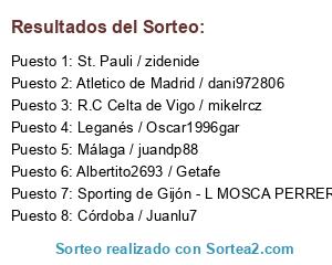 Lista de participantes: Córdoba / Juanlu7, Málaga / juandp88, Atletico de Madrid / dani972806, R.C Celta de Vigo / mikelrcz, St. Pauli / zidenide, Sporting de Gijón - L MOSCA PERRERA-, Leganés / Oscar1996gar, Albertito2693 / Getafe.