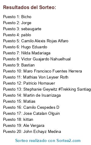 Lista de participantes: bicampeondeamerica, Diego Núñez Reo, Matias, @MarcoHerreraMorales, Carla Malatesta Steinmetz, Perla Marina Galván Pérez, Yorman Saul Carrasquel, Sapu2a, Ivan Mauricio Cardenas Bravo, Stephanie Geywitz #Trekking Santiago de Chile, Alepsi Acuña, Maximiliano Norambuena, Abi, Sebastián Vargas, Patricia Sandoval, Rats, Ricardo29, Marco Espinoza, Diego, Camilo Alexis Rojas Alfaro, liss olivares, Sebastián Avendaño, Elias Alonso, Marcelo Münzenmayer, Sergio Castro, Mathias Von Leyser Roth, pablo, Viviana Aguirre, sceronl, Francisco Faundez Bugueño, Gustavo Amenabar, Sebastián Burgos Ðiedrichs, aaron, felipe.ignc, Diego Caulier Marinovic, JuanJosé Villegas Pinto, Gonzalo Garcia Solis, sebapitbull, Pablo Esteban Lara Reyes, Jona Deathblacky, Exequiel, Carina Zúñiga Castro, Erwin Carrasco Toro, Edison Lecaros, Sebastián Díaz Muzio, Martín Caulier Marinovic, Bastian, Rodrigo Irarrázaval A, hmleal, Waldo Contreras Núñez, Felipe Tellez Barra, Mauriones, Cristóbal Chinchilla Saez, Diego HA, Teresita Hernández, Maro Francisco Fuentes Herrera, John Echayz Medina, Luis Felipe Torres Venegas, Roberto Andres Ruz Cisternas, Roberto Flores-Briones, Arturo Asencio Casanova, Nilda Madariaga, Cristóbal Albers, Cristopher F Garay, Jorge, Carla Moreno Wilson, Pablo Adolfo Yáñez Gálvez, @alexis.fronterizo, Rodrigo Antonio Castilla, pancho_henriquez, Diego Avilés, Homero Novoa, Pedro Feres, Nicortuga, jorgevera, Mirtha Solange Navarrete, Hector Daniel Martinez Verdugo🇨🇱, Tomás Díaz Hormazábal, Tomás Aylwin, Ian Franco Cárdenas Toloza, Nicodgnzlz, Pablo Andres Hernandez Baeza, veritopaz, Camilo Cespedes D, Nacho Garcés, sebaugarte, Angelo Faus, Victor Guajardo Nahuelhual, Ignacio Paredes Sanzana, Emanuel Sanchez Vargas, Gabriel Cisternas ChileBikes, abelen, Cata Alegria Olivera, Francisco Ramirez, Alvaro Mautz tri, Jennifer Duran Sepulveda, kittan, Bicho, Christian Aaron Ruiz Muñoz, echosierra, Patricio Hornauer, @resanchez, carolavial, Fernanda Ramírez, Chimueloco, koke, HR Bike Ovalle, Diego Esteban Santibañez Rojas, Gonzalo Fuentes Gesell, Vale, Hugo Eduardo, Fernando Carrasco, Martin de Iruarrizaga, Juan Enrique Rivera, Patricio Eduardo Castillo Ortiz, Ale Vergara, Jorge Aguirre, Manuel Anriquez, Alejandro, JFcardoza, youtube.com/megustachile, Carlos Celis, Javier Ignacio Molina, Felix Gerardo Cabrera, Pati Palta, Mathias Kramer S., Diego Caceres Fuentes, Lamotta.travel, fesalazaru, Nicolas Silva Muñoz, Nicolás Guajardo Fernández, Alvaro Rodrigo Lagos Garrido, Luis Rogelio Garrido Palavecino, Saimon Perez, Ignacio Vidal, Jose Catalan Olguin, Dirk, runcations, Constanza Cepeda, RS 🇨🇱, Heriberto Vallejos Vega, Koca Gutierrez, Eduardo Osorio, lftupper, Joshe Edu Rios, Maxi Ormeño Venegas, Ceciliapaz.