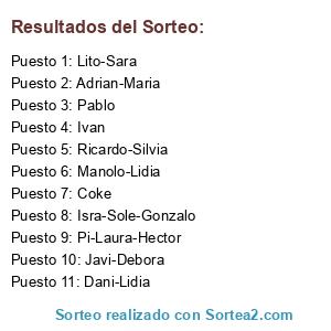 Lista de participantes: Lito-Sara, Javi-Debora, Adrian-Maria, Pi-Laura-Hector, Isra-Sole-Gonzalo, Manolo-Lidia, Ricardo-Silvia, Pablo, Ivan, Dani-Lidia, Coke.