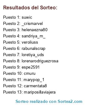 Lista de participantes: cmuru, veroliuss, loretiya_uds (2 participaciones), espe2591 (2 participaciones), rabunalscrap (2 participaciones), lorenarodriguezrosa, marypop_1 (2 participaciones), mariposillaviajera (2 participaciones), _crismarvel (2 participaciones), carmentata8 (2 participaciones), helenaezna80 (2 participaciones), sandriya_m_ (2 participaciones), suwic , suwic.