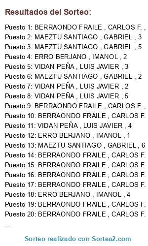 Lista de participantes: VIDAN PEÑA , LUIS JAVIER , 5, VIDAN PEÑA , LUIS JAVIER , 4, VIDAN PEÑA , LUIS JAVIER , 3, VIDAN PEÑA , LUIS JAVIER , 2, VIDAN PEÑA , LUIS JAVIER , 1, GONZALEZ GIL , MIKEL , 1, ERRO BERJANO , IMANOL , 1, ERRO BERJANO , IMANOL , 2, ERRO BERJANO , IMANOL , 3, ERRO BERJANO , IMANOL , 4, MAEZTU SANTIAGO , GABRIEL , 6, MAEZTU SANTIAGO , GABRIEL , 5, MAEZTU SANTIAGO , GABRIEL , 4, MAEZTU SANTIAGO , GABRIEL , 3, MAEZTU SANTIAGO , GABRIEL , 2, MAEZTU SANTIAGO , GABRIEL , 1, BERRAONDO FRAILE , CARLOS F. , 1, BERRAONDO FRAILE , CARLOS F. , 2, BERRAONDO FRAILE , CARLOS F. , 3, BERRAONDO FRAILE , CARLOS F. , 4, BERRAONDO FRAILE , CARLOS F. , 5, BERRAONDO FRAILE , CARLOS F. , 6, BERRAONDO FRAILE , CARLOS F. , 7, BERRAONDO FRAILE , CARLOS F. , 8, BERRAONDO FRAILE , CARLOS F. , 9, BERRAONDO FRAILE , CARLOS F. , 10, BERRAONDO FRAILE , CARLOS F. , 11.