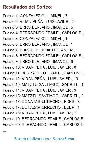 Lista de participantes: VIDAN PEÑA , LUIS JAVIER , 10, VIDAN PEÑA , LUIS JAVIER , 9, VIDAN PEÑA , LUIS JAVIER , 8, VIDAN PEÑA , LUIS JAVIER , 7, VIDAN PEÑA , LUIS JAVIER , 6, VIDAN PEÑA , LUIS JAVIER , 5, VIDAN PEÑA , LUIS JAVIER , 4, VIDAN PEÑA , LUIS JAVIER , 3, VIDAN PEÑA , LUIS JAVIER , 2, VIDAN PEÑA , LUIS JAVIER , 1, GONZALEZ GIL , MIKEL , 3, GONZALEZ GIL , MIKEL , 2, GONZALEZ GIL , MIKEL , 1, DONAZAR URRECHO , EDER , 3, DONAZAR URRECHO , EDER , 2, DONAZAR URRECHO , EDER , 1, ERRO BERJANO , IMANOL , 8, ERRO BERJANO , IMANOL , 7, ERRO BERJANO , IMANOL , 6, ERRO BERJANO , IMANOL , 5, ERRO BERJANO , IMANOL , 4, ERRO BERJANO , IMANOL , 3, ERRO BERJANO , IMANOL , 2, ERRO BERJANO , IMANOL , 1, MAEZTU SANTIAGO , GABRIEL , 5, MAEZTU SANTIAGO , GABRIEL , 4, MAEZTU SANTIAGO , GABRIEL , 3, MAEZTU SANTIAGO , GABRIEL , 2, MAEZTU SANTIAGO , GABRIEL , 1, BERRAONDO FRAILE , CARLOS F. , 10, BERRAONDO FRAILE , CARLOS F. , 9, BERRAONDO FRAILE , CARLOS F. , 8, BERRAONDO FRAILE , CARLOS F. , 7, BERRAONDO FRAILE , CARLOS F. , 6, BERRAONDO FRAILE , CARLOS F. , 5, BERRAONDO FRAILE , CARLOS F. , 4, BERRAONDO FRAILE , CARLOS F. , 3, BERRAONDO FRAILE , CARLOS F. , 2, BERRAONDO FRAILE , CARLOS F. , 1, BURGUI PEJENAUTE , ASIER , 2, BURGUI PEJENAUTE , ASIER , 1.