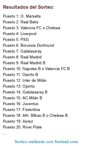 Lista de participantes: Oporto, Fiorentina, Málaga CF, Inter de Milán, Real Madrid, Liverpool, AC Milán, Atlético de Madrid, Parma, Juventus, Manchester City, Xerez, Ajax, Borussia Dortmund, PSG B, Oporto B, Galatasaray, Córdoba, Real Madrid B, River Plate B, Fiorentina B, O. Marsella, Galatasaray B, Parma B, River Plate, AC Milán B, M. City B, Real Betis, PSG, Napoles B o Valencia FC B, Ath. Bilbao B o Chelsea B, Valencia FC o Chelsea.