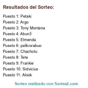 Lista de participantes: Petaki, Chachotu, Tony Montana, Argo, Frankie, Alook, Tete, Abun3, pallicorabuo, Elmenda, Sidvicius.