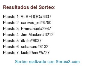 Lista de participantes: Joaquin#8346, !IzumiNoBowser#1311, Nixuizu#1949, Aryne#6655, BaallxD#0164, Pablo#9408, alexander_ktk#9958, Esme#7037, Moonlight#5806, Neoxz#0857, Breew18#0856, Fredy-R#1785, Dano#6174, Cookie#8776, Violatronix#3915, Hiro Kun#0182, Ragged#3637, Anteros#7598, yashun#2244, lucho#4448, Lumy™#1752, FredoS2#7632, RMA😇😈#8371, erevent#6692, Sole#6417, criatura#1062, CbCd#7431, Ovejero#6445, FromHeroToZero#0463, [UwU]#7428, AdrianYarny#9149, Glargian#3814, M̶̛̎i̴͒̽s̶͗͐ĥ̸̀ȕ̷#9975, shusita#8834, sebasuru#8132, Eme#0880, Maximiliano.M#8030, Aioros#4859, Hoshi_1412#7645, Alan-blink#6190, P A T#6316, deathdrak#7541, decimods#5712, Krl0z#6164, Namzak#6379, omaralonso#4772, Travi§#8357, Neil.#7941, aldairux#9218, Beny#2888, souta#9376, Alex Kyrielite#9442, Gabito9992#3263, Thlipsi#4401, Iván#0856, Arucark#7322, darktez#9171, Dummy Slayer#9147, Androw#3227, Nando#8075, Emmanuel#2947, Cintyvc#2824, fercatherGG B]#4310, Kuriki#3825, Miku Chan#6455, Edo#5532, Nemi#0812, dk ito#9037, Gewe#9567, Jaeger#1017, ☆;+;。・𝓟𝓸𝓵𝓪𝓻𝓲𝓼・。;+;☆#1021, TonySenpai#6100, DeibyTex#9200, severus#2038, ✌ Chris ✌#1796, migueljsd#9335, Vicke ~#8705, pepe berrinches#1727, Bibianz#1989, jhayjozerav#4051, aldo#8840, kiranick86#2261, Bohe#4063, Samleth#9910, Dokkä#2819, Deltarys#5909, truterth#1156, Aniitaa^™#4826, El Tino#5342, damd#5460, Mahkakko!#5380, CapitAn#9656, XAVIER.88#3994, zendory0199#2894, trollk#0066, kioto25mr#5727, Libe~*#7453, Rina Li#0853, Lizz#1156, rafa#5167, Black Sword#8144, Nova👑#6239, Nefer#7664, flori#1878, kornerita#9545, ikaros006#9194, ELPETULANTE#4176, aass#7303, Affar#6654, Gonzo#5529, Corentin#3033, p3p3#5099, Hermes#8310, therion#8522, Shaman Free Style#6807, Devil Brando~#4526, Nicufis#2828, Mei#8128, emilio#5405, Mostaza -#8887, Sinoe#3140, Triari#1463, Rakelin#0097, Will.#8034, Tio Lucho#7493, Suiziter [Mancos INC]#7324, Niyasaky [Mancos INC], Ironside#7243, Kayneo [Mancos INC]#3934, Dev Obiwan#2352, LemLem#9181, isak#5504, 𝑩𝒍𝒂𝒄𝒌 𝑬𝒎𝒑𝒆𝒓𝒐𝒓𝒔 卍#4920, TacoFiuFiu#4071, Lavizth#3873, BlackNeoUwU#7165, carliwis_xd#6790, ALBEDOO#3337, KinGTetton#1998, 绵绵#9269, 🌸 Yuuri 🌸#5105, Jim Macken#3212, KasathMs#8809, KuroValx#2407, !Meron#3764, LicaonYugo#5958.