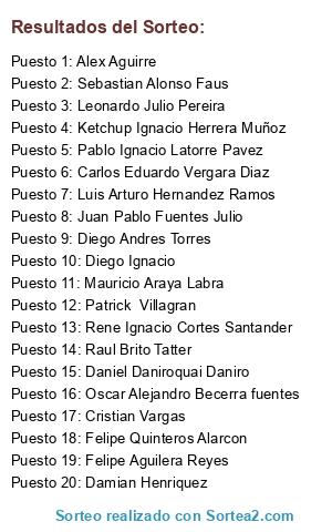 Lista de participantes: Pablo Ignacio Latorre Pavez, Oscar Alejandro Becerra fuentes, Carlos Eduardo Vergara Diaz, Luis Arturo Hernandez Ramos, Ketchup Ignacio Herrera Muñoz, Felipe Aguilera Reyes, Felipe Quinteros Alarcon, Raul Brito Tatter, Mauricio Araya Labra, Daniel Daniroquai Daniro, Damian Henriquez, Diego Andres Torres, Alex Aguirre, Patrick Villagran, Leonardo Julio Pereira, Sebastian Alonso Faus, Rene Ignacio Cortes Santander, Juan Pablo Fuentes Julio, Diego Ignacio, Cristian Vargas.