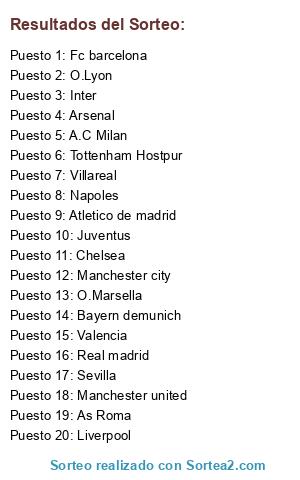 Lista de participantes: Arsenal, Manchester united, Sevilla, Bayern demunich, Real madrid, Manchester city, Atletico de madrid, Juventus, A.C Milan, O.Marsella, Villareal, O.Lyon, Napoles, Tottenham Hostpur, Inter, Fc barcelona, Valencia, As Roma, Chelsea, Liverpool.