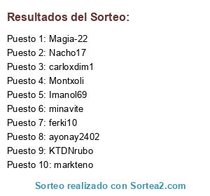 Lista de participantes: KTDNrubo, carloxdim1, ferki10, Montxoli, markteno, minavite, Nacho17, Imanol69, Magia-22, ayonay2402.