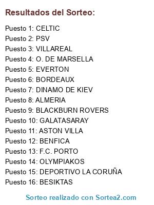 Lista de participantes: DEPORTIVO LA CORUÑA, BESIKTAS, BENFICA, GALATASARAY, CELTIC, ASTON VILLA, ALMERIA, EVERTON, BORDEAUX, DINAMO DE KIEV, PSV, O. DE MARSELLA, VILLAREAL, F.C. PORTO, OLYMPIAKOS, BLACKBURN ROVERS.