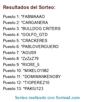 Lista de participantes: 1. ALEXSANFER11, 2. CARLOS_LOBO_677, 3. LUYZ10, 4. ACEITUNO003, 5. ACOIDAN23GR, 6. ALEXINGO10, 7. ARANDA994, 8. ASPERO11, 9. AYOZE97, 10. BRIANROBAYNA, 11. BRIBOM27, 13. BYTOSII, 14. COLAITO12, 15. CONGRATULATIONSH, 16. CRISTIANMRG01, 17. CRISTIANRG90, 20. ELKAWE18, 22. ER_ANTONHITO, 23. ERICBLANC, 24. ERLOLITO69, 25. F18NAZA00, 29. IISMAEL_CPRTES, 30. IVANCHU_SANFER1, 31. J_SANTANA7, 32. JAVIGRUZ, 33. JAVI_KHAN1989, 35. JESUZ818, 36. JINAMAR20, 37. JONIBONBITA, 38. JUANEPAISA2000, 39. JUANFRANMONTES20, 40. JVLM12, 41. KISKOMOYA, 42. MAIKELSITO, 43. MARCO_MH01, 44. MATAIUS20, 45. MESSI_FROOME29C, 46. MIGUEJR10, 48. NAMII_VSL, 49. NICOO9_, 50. NIETOAVILA7, 51. PACOLI1992, 53. PERCUCION, 56. PULPIYO91, 58. REYDELESTRECHO97, 59. RUBENCEETEE_, 60. RUBENIKEDIEZ, 62. SAMUELXIXA, 64. SANDROSAMBA10, 65. SEIJO4, 66. SEVIGOLL, 68. TARUGO1975, 69. B_,MARTINEZ03, 71. URI14CASTELLER.