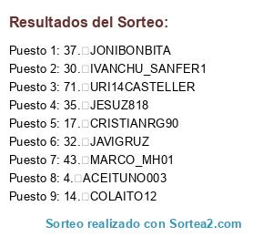 Lista de participantes: 1. ALEXSANFER11, 3. LUYZ10, 4. ACEITUNO003, 5. ACOIDAN23GR, 6. ALEXINGO10, 8. ASPERO11, 10. BRIANROBAYNA, 11. BRIBOM27, 13. BYTOSII, 14. COLAITO12, 15. CONGRATULATIONSH, 17. CRISTIANRG90, 20. ELKAWE18, 22. ER_ANTONHITO, 24. ERLOLITO69, 29. IISMAEL_CPRTES, 30. IVANCHU_SANFER1, 31. J_SANTANA7, 32. JAVIGRUZ, 33. JAVI_KHAN1989, 35. JESUZ818, 37. JONIBONBITA, 38. JUANEPAISA2000, 39. JUANFRANMONTES20, 40. JVLM12, 41. KISKOMOYA, 42. MAIKELSITO, 43. MARCO_MH01, 44. MATAIUS20, 45. MESSI_FROOME29C, 46. MIGUEJR10, 49. NICOO9_, 50. NIETOAVILA7, 51. PACOLI1992, 53. PERCUCION, 56. PULPIYO91, 58. REYDELESTRECHO97, 60. RUBENIKEDIEZ, 62. SAMUELXIXA, 64. SANDROSAMBA10, 65. SEIJO4, 66. SEVIGOLL, 68. TARUGO1975, 69. B_,MARTINEZ03, 71. URI14CASTELLER.