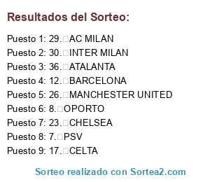 Lista de participantes: 1. BORUSSIA DORTMUND, 3. BAYERN MUNICH, 7. PSV, 8. OPORTO, 9. SPORTING LISBOA, 12. BARCELONA, 17. CELTA, 20. PSG, 23. CHELSEA, 26. MANCHESTER UNITED, 27. TOTTENHAM, 29. AC MILAN, 30. INTER MILAN, 36. ATALANTA.