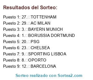 Lista de participantes: 1. BORUSSIA DORTMUND, 3. BAYERN MUNICH, 8. OPORTO, 9. SPORTING LISBOA, 12. BARCELONA, 20. PSG, 23. CHELSEA, 27. TOTTENHAM, 29. AC MILAN.