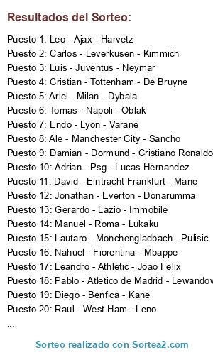 Lista de participantes: Leo - Ajax - Harvetz, Santiago - Arsenal - Pavard, Martin Leggio - Aston Villa - Messi, Leandro - Athletic - Joao Felix, Pablo - Atletico de Madrid - Lewandowski, Sebas - Barcelona - Agüero, Ema - Bayer Munich - Muller, Diego - Benfica - Kane, Yirbel - Chelsea - Haaland, Damian - Dormund - Cristiano Ronaldo, Jonathan - Everton - Donarumma, Nahuel - Fiorentina - Mbappe, Andres - Inter - Gnabry, Luis - Juventus - Neymar, Gerardo - Lazio - Immobile, David - Eintracht Frankfurt - Mane, Carlos - Leverkusen - Kimmich, Luciano - Liverpool - Bruno Fernandes, Endo - Lyon - Varane, Ale - Manchester City - Sancho, Ale - Manchester United - Verrati, Lucas - Marsella - Son, Ariel - Milan - Dybala, Lautaro - Monchengladbach - Pulisic, Tomas - Napoli - Oblak, Frank - Newcastle - Cancelo, Diego - Porto - Camavinga, Adrian - Psg - Lucas Hernandez, Fede - RealMadrid - Hazard, Manuel - Roma - Lukaku, Joander - Schalke - Van Dijk, Tomas - Sevilla - F. De Jong, Rafael - Sporting Lisboa - Rashford, Cristian - Tottenham - De Bruyne, Ema - Valencia - Reus, Raul - West Ham - Leno.