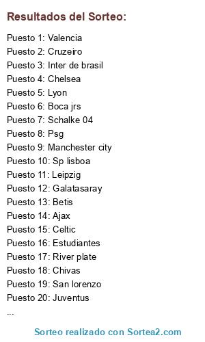 Lista de participantes: Estudiantes, Gremio, Corinthians, Hamburgo, Porto, Stuttgart, Celtic, Galatasaray, Arsenal, Napoli, Manchester city, Moenchglabach, Sevilla, Betis, River plate, Independiente, Newcastle, Lyon, Cruzeiro, Boca jrs, West ham, Leipzig, Valencia, Nuremberg, Racing, Liverpool, Juventus, Ajax, Chelsea, Chivas, Monterrey, Astón villa, Sp lisboa, Feyenoord, Fiorentina, Athl bilbao, Psg, Schalke 04, Inter de brasil, San lorenzo.