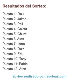 Lista de participantes: Jaime, Tony, Raul, Alex, Peli, Pablo, Chumi, Edu, Coleta, Aton, Isma, Ruiz.