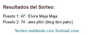 Lista de participantes: 1 Iria San Juan Perez, 2 Marisa Cerezo P, 3 Almudena Verdú, 4 Soraya Rodríguez Baena, 5 Soraya1889 (blog probar productos), 6 Maria Lopez Maxia, 7 anyol (blog probar productos), 8 anyol (blog Don pako), 9 Marise Baena Gutierrez, 10 Alicia Carrero Marcos, 11 Ali (blog probar productos), 12 Ali (blog don pako), 13 Maria Eugenia Arias Lozano, 14 maria eugenia (blog probar productos), 15 maria eugenia (blog don pako), 16 Aideta Martín Roig , 17 Concepcion Matias Simarro, 18 Concepción matias simarro (blog probar productos), 19 Concepción matias simarro (blog don pako), 20 Jemma Bcn, 21 gemma (blog probar productos), 22 gemma (blog don pako), 23 Katerina Knyazhechenko, 24 Keterina (blog probar productos), 25 Keterina (blog don pako), 26 Montse Prieto, 27 Montse PM (blog probar productos), 28 Montse PM (blog don pako), 29 Sandra Ferré, 30 Sandra Ferré (blog probar productos), 31 Sandra Ferré (blog don pako), 32 Vanessa Muñiz Alvarez, 33 Yeneva (blog probar productos), 34 Yeneva (blog don pako), 35 Alexia Ferré, 36 Ana Cristina Sanchez Peña, 37 Ali Grande, 38 Ali Grande (blog probar productos), 39 Ali Grande (blog don pako), 40 Noemi Amy Cantos Terron, 41 Ana Vazquez, 42 Aniña (@vampyevil) (blog probar productos), 43 Aniña (@vampyevil) (blog don pako), 44 Noelia Mellado Zapata, 45 Atharys (blog probar productos), 46 Atharys (blog don pako), 47 Elvira Maja Maja, 48 Keka22 (blog probar productos), 49 Keka22 (blog don pako), 50 Maria Wasmer Romero, 51 Mariah (blog probar productos), 52 Mariah (blog don pako), 53 Jose Ignacio Martinez Gonzalez, 54 Jose ignacio (blog probar productos), 55 Jose ignacio (blog don pako), 56 Raquel García, 57 Raquel Garcia (blog probar productos), 58 Raquel Garcia (blog don pako), 59 Nieves Moreno, 60 Nieves Moreno (blog probar productos), 61 Nieves Moreno (blog don pako), 62 Angela Carpente Garcia, 63 Maria Sanchez Artiaga, 64 Juan Lanzas, 65 Juan L. (blog probar productos), 66 Juan L. (blog don pako), 67 Irene García Jurado, 68 Tapujos Entre Libros, 69 cazoleando (blog probar productos), 70 cazoleando (blog don pako), 71 Esther Vm, 72 Alex Pilici, 73 alex pilici (blog probar productos), 74 alex pilici (blog don pako), 75 Ana Carballo, 76 Ninania (blog probar productos), 77 Ninania (blog don pako), 78 Mara Mar, 79 Aintzanika Lopez, 80 Maruchi Rocha Frutos, 81 Maruchi (blog probar productos), 82 Ireniya Curranta, 83 Virginia Acevedo, 84 Virgina Acevedo (blog probar productos), 85 Virgina Acevedo (blog don pako), 86 Soledad Rodriguez Lopez, 87 La soledad (blog probar productos), 88 La soledad (blog don pako).