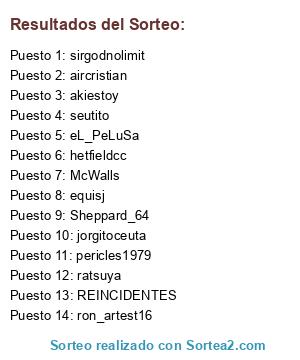 Lista de participantes: Sheppard_64, REINCIDENTES, aircristian, pericles1979, equisj, alroi, ratsuya, eL_PeLuSa, akiestoy, hetfieldcc, seutito, sirgodnolimit, ron_artest16, McWalls.
