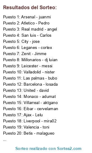 Lista de participantes: Real madrid - angel, Valladolid - nister, Leganes - cortex, Barcelona - losada, Las palmas - bubo, United - david, Sampdoria - rafa perez, City - jose, Arsenal - juanmi, San luis - Carlos, Leicester - messi, Hereenven - patataa, Monaco - adumat, Eibar - cervelaman, Chelsea - Jordi, Ajax - Lelu, Liverpool - mira02, Dortmund - diego, Atletico - Pedro, Zenit - Jimme, Millonarios - dj luian, Betis - malagueo, Villarreal - aktgano, Valencia - toni.