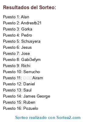 Lista de participantes: Airam, Pedro, Alan, Andrestb21, Gabi3efym, Gorka, James George, Richi, Ruben, Saul, Schusyera, Serrucho, Daniel, Pozuelo, Jesus, Jose.
