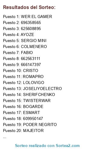 Lista de participantes: IMPARABLE, FABIO, TWISTERWAR, RAFUKA, ESMART, MAJEITOR, SERGIO MINI, PODER NEGRITO, 696358565, ROMAPRO, 666147397, SHERIFCHENKO, CRISTO, COLMENERO, 662563111, AYOZE, LOLOVIGO, BOGARDE, 609950147, MANUWATAGATA, JOSELIYOELECTRO, WER EL GAMER, 625608895, MIMIAGUERO.