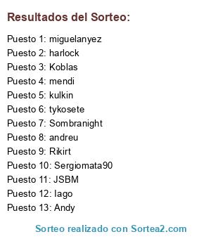 Lista de participantes: miguelanyez, Andy, Rikirt, JSBM, andreu, mendi, tykosete, Koblas, Sombranight, Iago, Sergiomata90, kulkin, harlock.