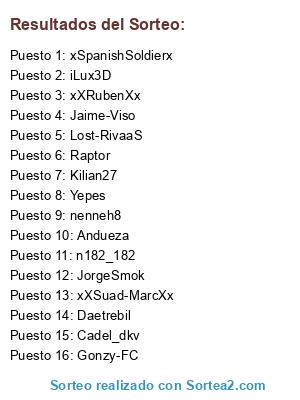 Lista de participantes: Cadel_dkv, Lost-RivaaS, iLux3D, Kilian27, xSpanishSoldierx, Gonzy-FC, Raptor, JorgeSmok, Jaime-Viso, xXRubenXx, Daetrebil, Andueza, Yepes, xXSuad-MarcXx, n182_182, nenneh8.