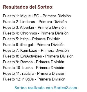 Lista de participantes: Kamikaze - Primera División, EvilActivities - Primera División, bshp - Primera División, Alberkin - Primera División, Ramos - Primera División, ithorgal - Primera División, Chronnos - Primera División, Linderas - Primera División, raulaia - Primera División, ni0g0s - Primera División, bucks - Primera División, MiguelLFG - Primera División.