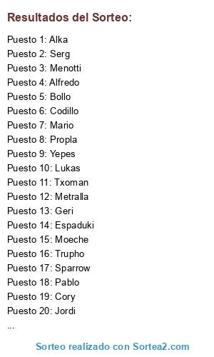 Lista de participantes: Ivan, Mario, Alberto, Riki, Jordi, Txoman, Xou, Soux, Yelkin, Menotti, Cory, Metralla, Pablo, Yepes, Carlos Iniesta, David, Trupho, Nauti, Alka, Moeche, Pipo Pipo, Alfredo, Ruly, Serg, Sparrow, Juanma, Geri, Carlos Rodriguez, Esku, Bollo, Propla, Adrian Pintiado, Lukas, Xevi, Codillo, Espaduki.